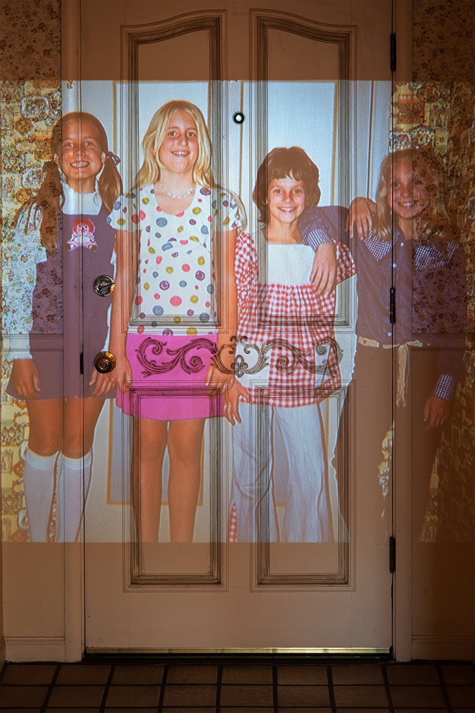 projecting family photographs onto the walls of her childhood home. Her layered compositions